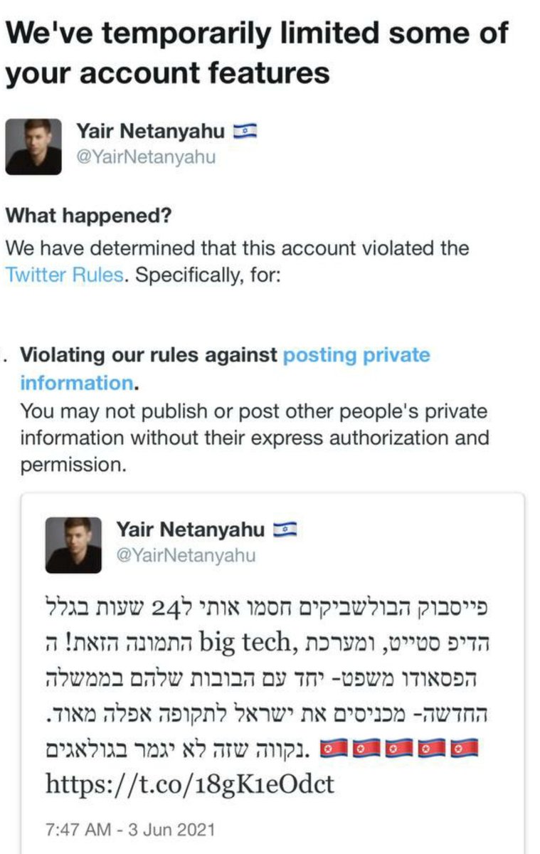 האירוע של אסי בוזגלו יצא מכלל שליטה יאיר נתניהו. חסימתו של יאיר נתניהו בטוויטר ובפייסבוק אמש (חמישי) וכן חסימתו של איש התקשורת יותם זמרי, הביאה את הליכוד לשגר היום שורה של ציוצים עם תיוג של ג'ק דורסי מנכל טוויטר ומארק צוקרברג מייסד פייסבוק, בטענה להפסיק.